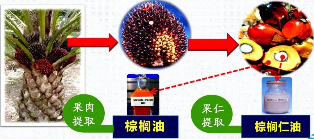 棕櫚油與棕櫚仁油的化學(xué)組分有顯著差異,棕櫚油是以棕櫚酸和油酸為主的飽和度約為50%的植物油,而棕櫚仁油是以月桂酸為主的飽和度為80%的植物油。我們常用的棕櫚油特指由果肉壓榨的棕櫚油,不包含棕櫚仁油。
